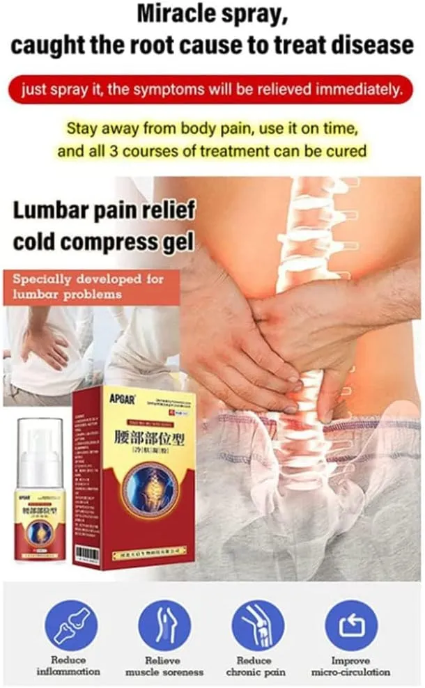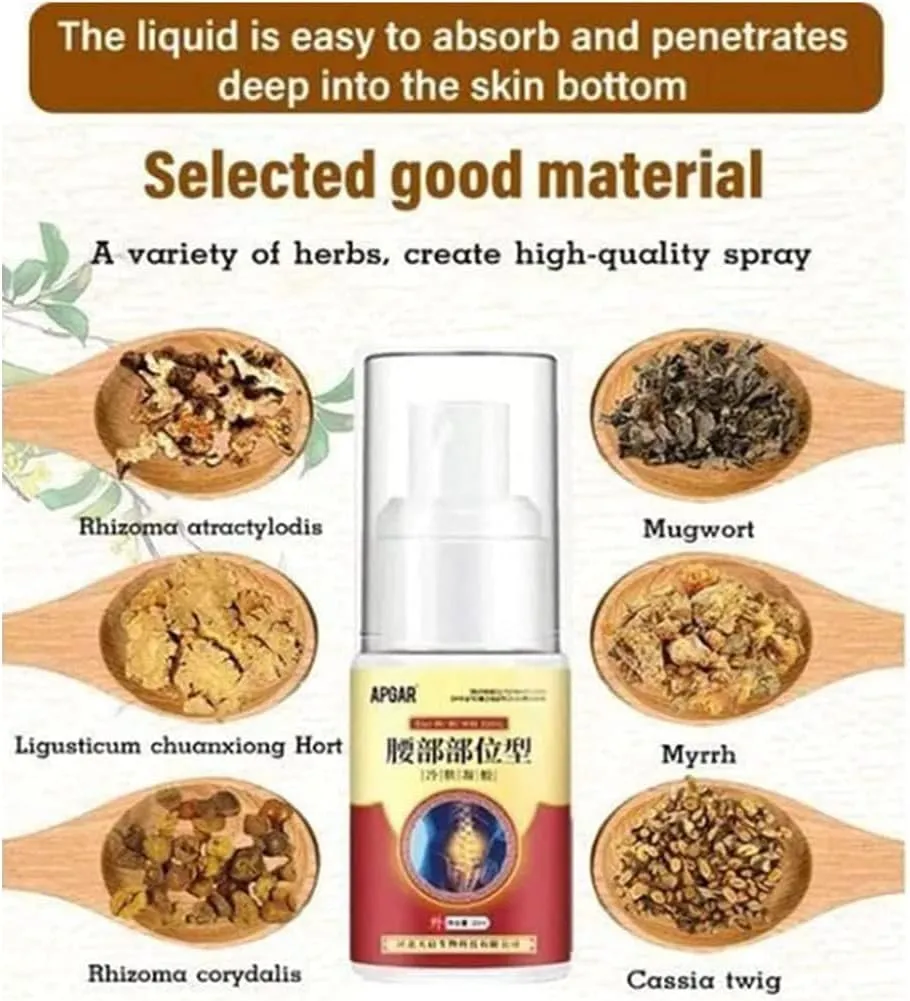 The Lumbar Pain Relief Herbal Spray is a natural cold compress gel spray designed to ease discomfort in the spine, joints, and muscles. Crafted with herbal plant extracts, it combines ancient production methods with modern technology for safe and effective relief.